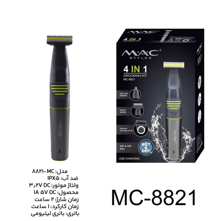 یک ریش تراش برقی به شما امکان می دهد بدون اینکه وقت زیادی را صرف کنید ، صورت و بدن صاف و تمیزی داشته باشید. علاوه بر این ، به پوست صدمه نمی رسد و از این طریق از بریدگی و کبودی جلوگیری می کند. ماشین اصلاح مکاستایلر مدل MC-8821 یکی از معروفترین مدل های موجود در اصلاح و خطوط است که دارای 4 سری مختلف هست در واقع مکاستایلر برای مردانی طراحی شده است که از ته ریش یا ریش استفاده می کنند. این مدل هر طولی از ته ریش را اصلاح می کند، خطوط می کند و می تراشد. تکنولوژی منحصر به فرد تریمر شامل یک واحد برش با حرکت سریع با حداکثر 200 ضربه در ثانیه و یک سیستم حفاظتی دوگانه است. برای راحتی بیشتر و دید بهتر، دستگاه را می توان به هر جهتی حرکت داد. Trimmer حتی هنگام اصلاح در برابر رشد مو، پوست را تحریک نمی کند. زیرا ماشین اصلاح به پوست نزدیک نیست. لازم به ذکر است سری شیور کوچک این دستگاه جهت اصلاح راحتتر و بهتر نواحی به کار میره که دسترسی به آن سخت هست همچنین به منظور اصلاح موهای بلند تر می توانید از سری تریمر شانه دار استفاده کنید که قابلیت تنظیم طول تیغه ها رو از 0.5 تا 10 میلی متر را داراست. همچنین به همراه دستگاه یک سری موزن گوش و بینی جهت اصلاح راحتتر موهای زائد بینی و گوش وجود دارد. از دیگر قابلیت های این دستگاه IPX5 بودن آن است که امکان استفاده به صورت خشک و مرطوب را فراهم کرده همچنین ماشین اصلاح 4 کاره مک استایلر مجهز به باتری قابل شارژ با کابل USB هست که با 2 ساعت شارژ تا 60 دقیقه قابل استفاده هست و دارای سه سرعت قابل تنظیم است.